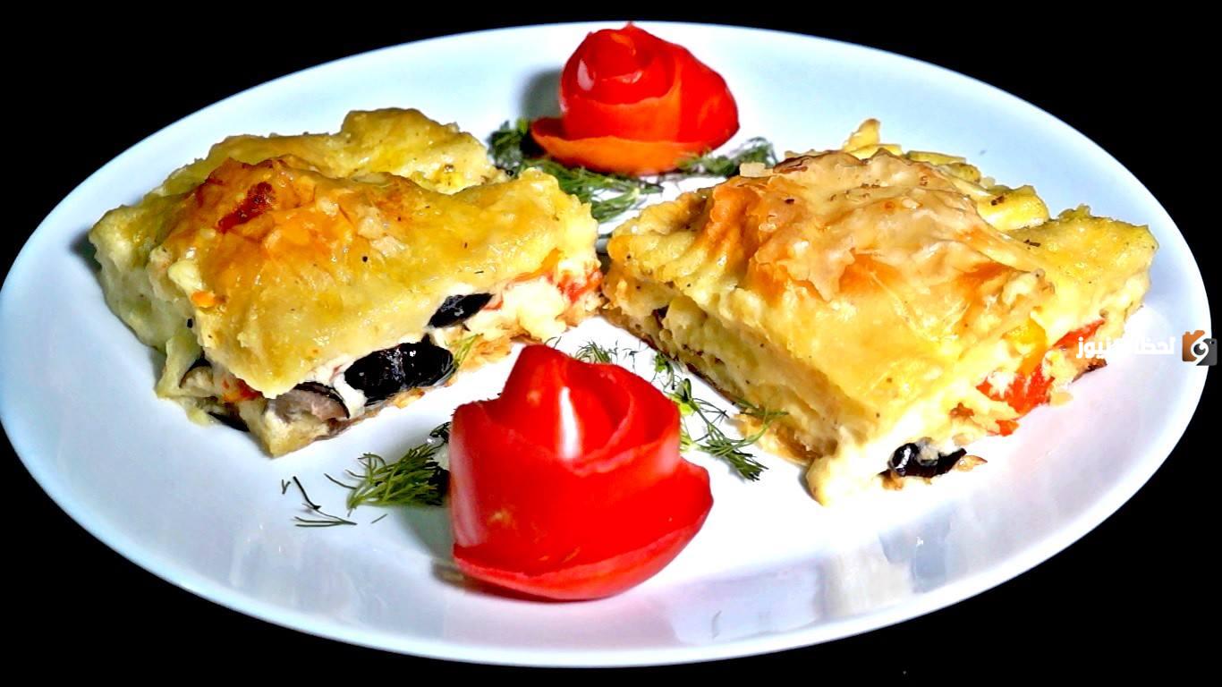 - يتم توزيع حشوة الخضروات بالتساوي، ثم تغطية الحشو براقات الجلاش مع مراعاة دهن كل راقة بالزبدة.