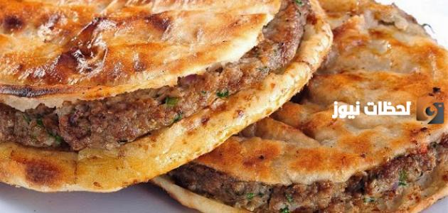 - يتم فرد كرة من العجين على سطح العمل، ووضع حشوة اللحك في وسط العجينة وغلقها ومن ثمَّ الفرد.
