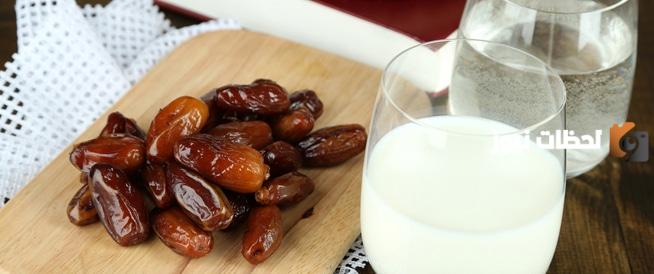 - الإفطار: تناول عدد 5 حبات من التمر مع كوب من الحليب الخالي من الدسم.