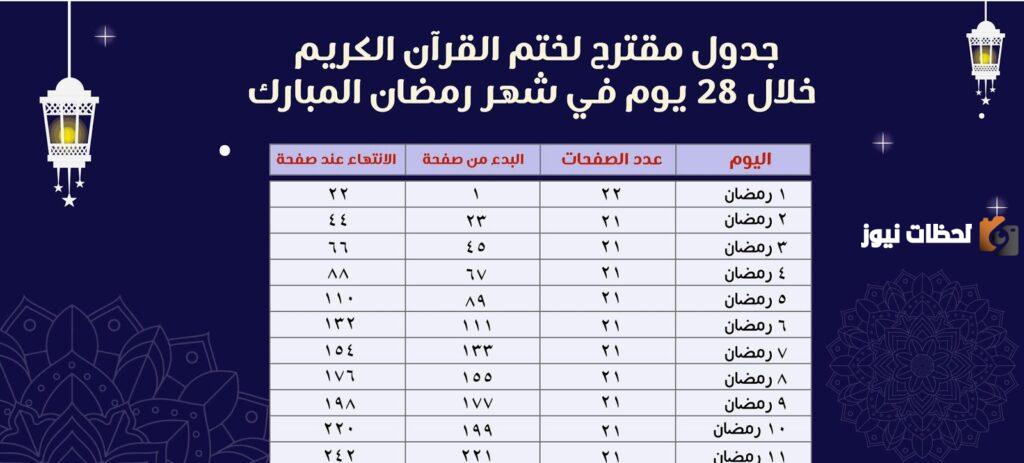 هناك جدول صفحات ختم القرآن الكريم مرة او مرتين أو ثلاث مرات، من خلال قراءة عدد الصفحات المطلوبة قبل أو نهاية الفرض، وسوف نتناول الجدول فيما يلي: