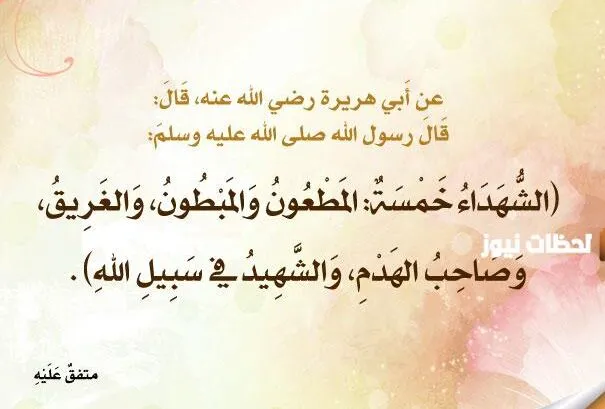 ورد سؤال عمن هم الشهداء ومن هو المبطون في حديث الرسول صلى الله عليه وسلم باعتبار أن الرسول صلى الله عليه وسلم ذكر 5 حالات عند وقوعها يعتبر الميت من الشهداء، والذي يحصل على المنزلة العالية، ومن خلال موقع لحظات نيوز إليكم من هو الشهيد المبطون، وما أجر الشهيد عند الله تعالى.