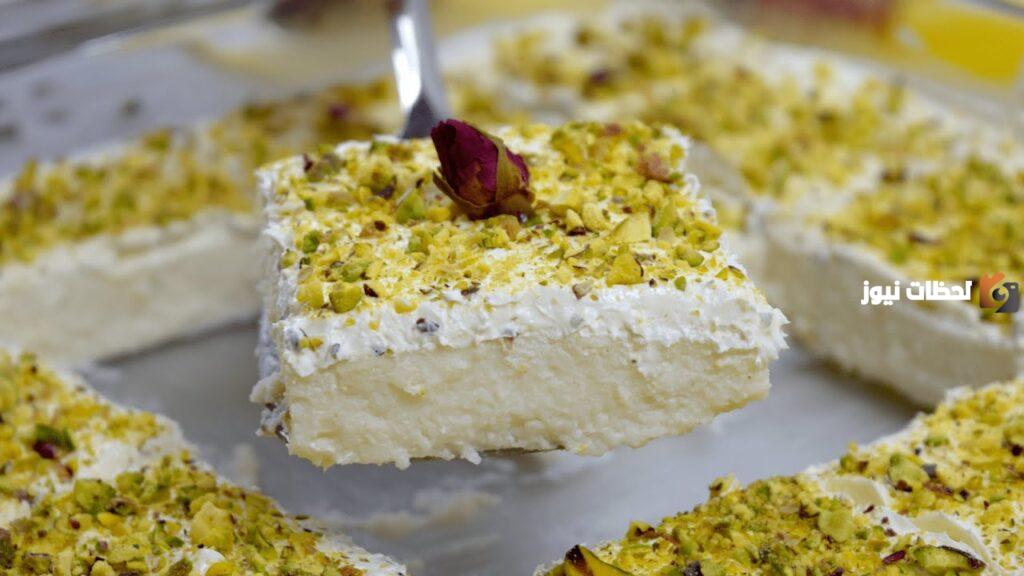 - ثم نضعها في الثلاجة لمدة 60 دقيقة حتى تتماسك جيدًا ثم تقطع إلى قطع متوسطة الحجم ونضع عليها الشربات وتقدم باردة.