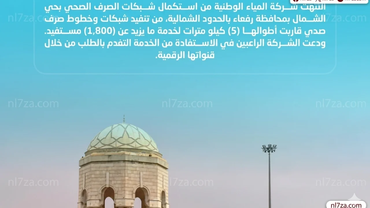 أعلنت شركة المياه الوطنية في السعودية الانتهاء من تنفيذ شبكات الصرف الصحي بحي الشمال في محافظة رفحاء بمنطقة الحدود الشمالية، في إطار جهودها لرفع كفاءة التشغيل وتوسيع نطاق الخدمات وتحسين جودة الحياة للسكان،
