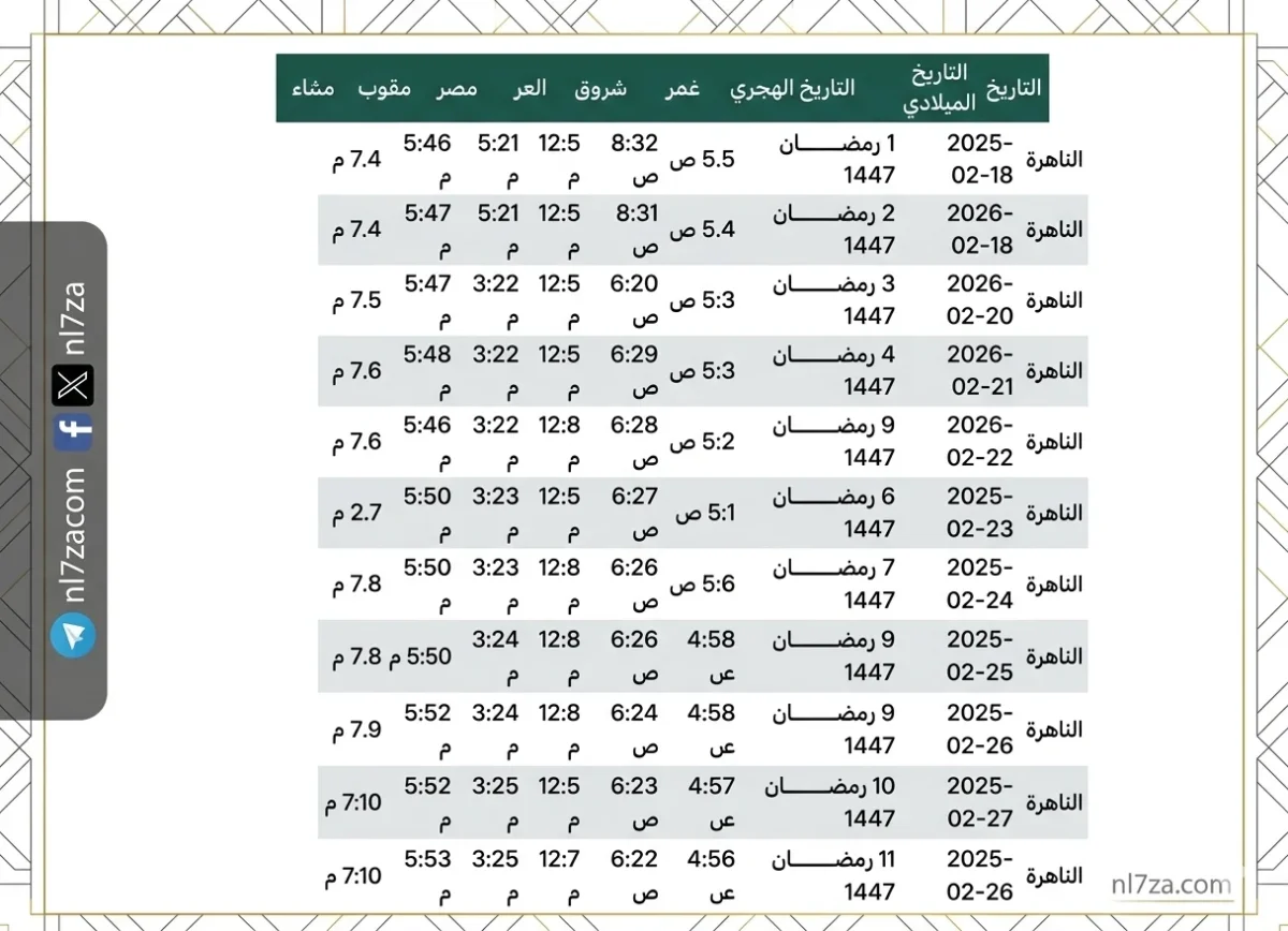 الإمساكية اليومية: موعد أذان الفجر وساعات الصيام اليوم الـ22 من رمضان 2026 في القاهرة