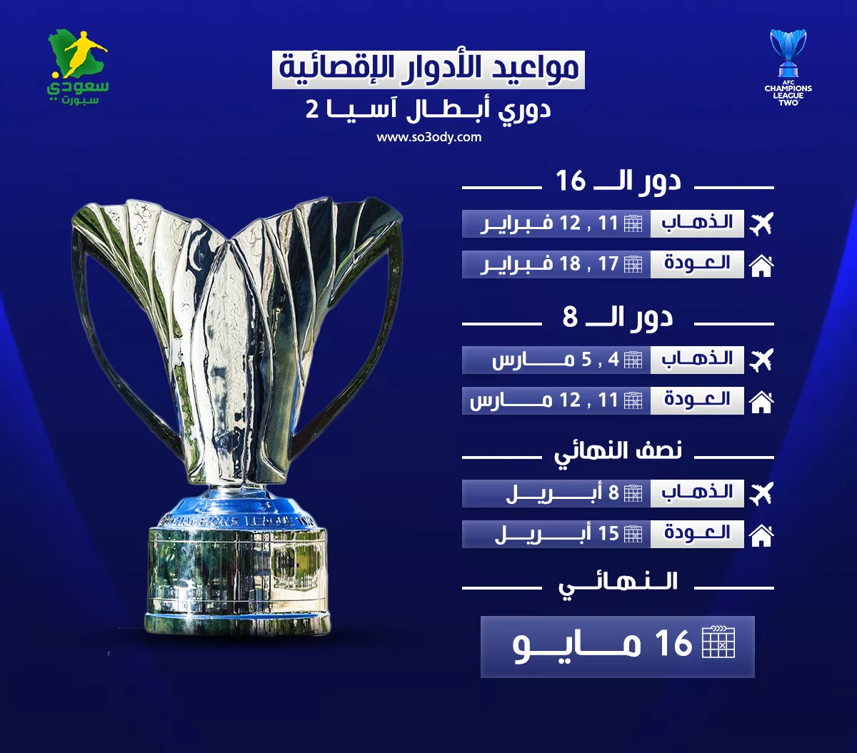 قامت اللجنة المسؤولة عن تنظيم دوري أبطال آسيا 2 بالإعلان عن الجدول الزمني الرسمي للأدوار الإقصائية، حيث يشارك نادي النصر السعودي بصورة وحيدة في هذه البطولة القارية الهامة. انطلقت المباريات وفق الجدول المعد مسبقاً، حيث من المقرر أن يبدأ دور الـ16 في فبراير 2026، وذلك من خلال إقامة مباراتي الذهاب يومي 11 و12 فبراير، تليها جولات الإياب في يومي 17 و18 من نفس الشهر.